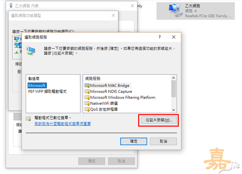 如果 "這個連線使用下列項目" 中,沒有看到 "VirtualBox Bridge Network" 等字眼的項目的話,就是缺少了!點選 "安裝"